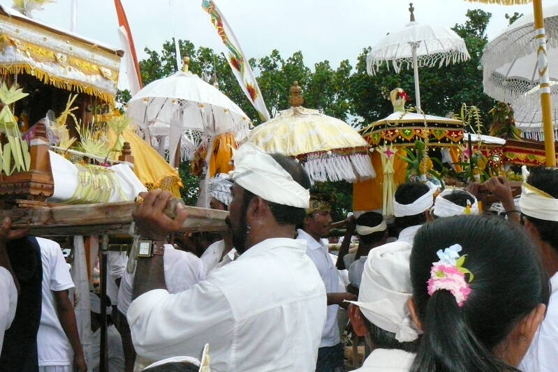 Daarna was het weer tijd om terug te gaan naar de villa. Na nog even wat eten gekocht te hebben in het kleine supermarktje van Seririt togen we naar Lokapaksa, om er vast te stellen dat de weg naar de villa afgesloten was voor alle verkeer wegens een ceremonie op het strand. Dus Lieke en ik met de benenwagen de twee kilometer of zo naar de villa toe, onder een brandende zon. Zoals je kunt merken overleefden we het, al doken we bij aankomst onmiddellijk onder het stortbad. Daarna gebruikten we deze laatste kans om onze sarong aan te doen en gingen naar de ceremonie op het strand kijken die nog steeds aan de gang was.