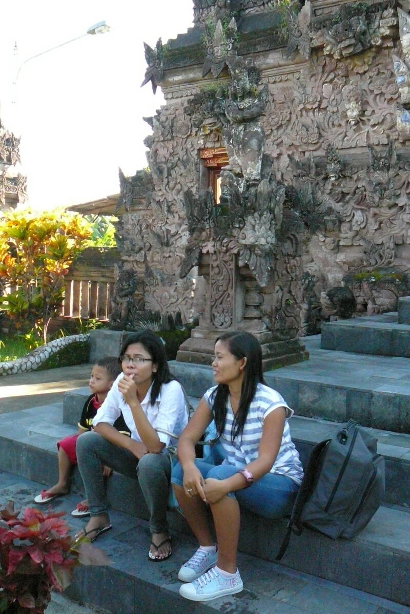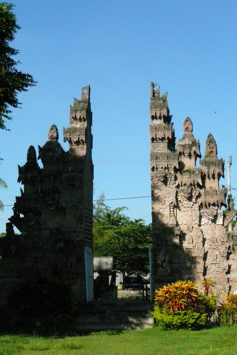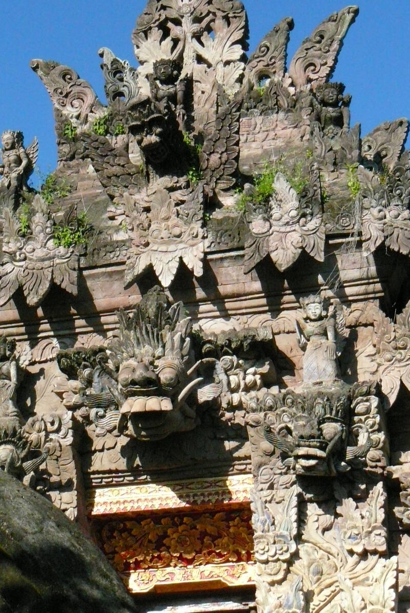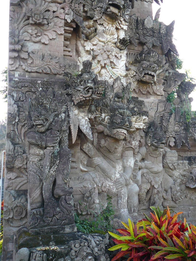 Eerst ging het naar de tempel Pura Beji in Sangsit. Meteen de mooiste die we al gezien hebben. Sangsit bevindt zich ten oosten van Singaraja. De Pura Beji is een tempel gewijd aan Dewi Sri, de godin van de rijst. Dit heiligdom dateert van de 15de eeuw en is versierd met talrijke naga (slangen), symbolen van de aarde en de vruchtbaarheid. Ze vormen de balustrade van een prachtige poort. Schitterende fabeldieren en duivelse wachters liggen op de loer tussen de planten. Rijen stenen torens verheffen zich boven de terrassen en vormen een labyrint van roze zandsteen. De binnenhof is ruim en open, met alleen maar enkele frangipanibomen ter versiering.