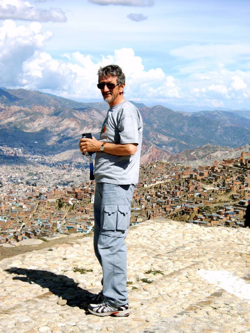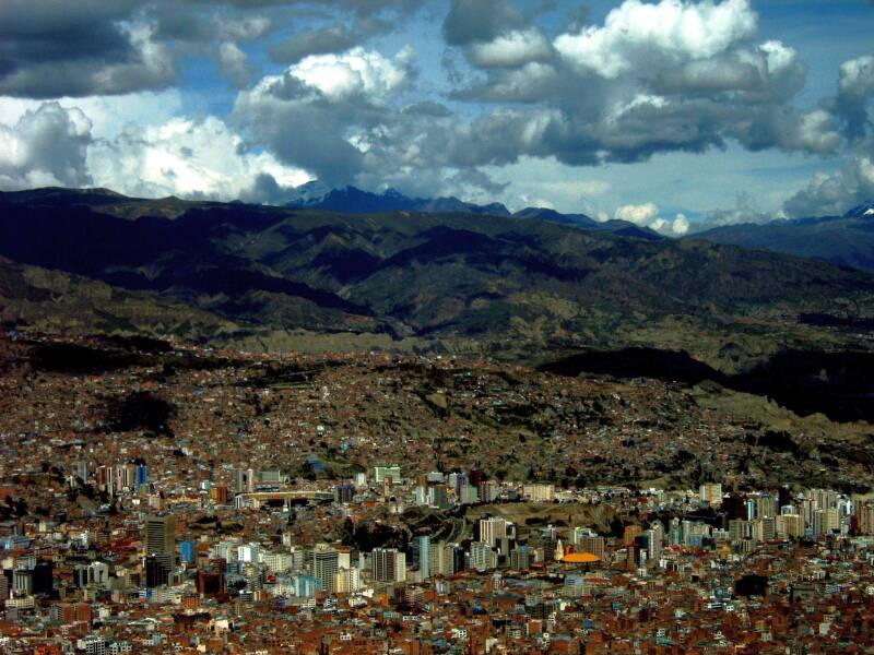 Voor we weer in de stad kwamen hield het busje halt op een plek waar we een ongelofelijk panoramisch zicht hadden op de vallei waarin La Paz ligt, en de heuvels en bergen er rond. Geloof me vrij, dit is een panorama dat je nooit meer vergeet! De huizen vullen niet alleen de vallei, maar ook de omringende heuvels. Het hoogteverschil tussen de benedenstad en de bovenstad is zowat 1.000 meter! Daarom is dit een stad waar de rijkere lagen van de bevolking nu net niet in de heuvels maar wel in de vallei wonen. Als je een kilometertje hoger je huisje hebt, dat voel je, geloof me vrij.