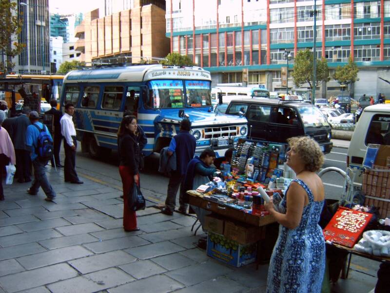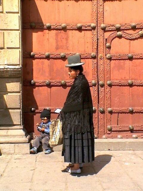 De sfeer op het plein voor de kerk is heel apart. Er lopen altijd veel mensen rond die je al of niet dingen willen aansmeren, en kinderen, en oud-strijders van de Chaco-oorlog in een stil protest voor het kleine pensioentje dat ze maar uitgekeerd krijgen. De zon scheen en net als vele anderen gingen we op de trappen voor de kerk zitten en keken geboeid naar La Paz en zijn bewoners.