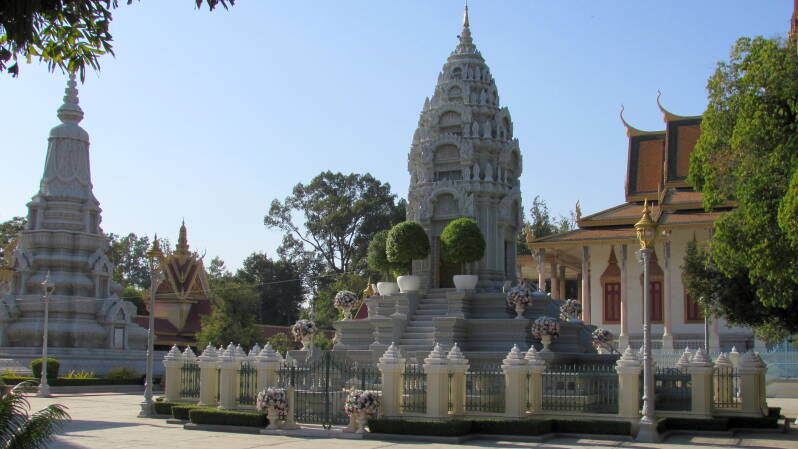 De grootste attractie is de Zilveren Pagode. Ze dankt haar naam aan de 5329 zilveren vloertegels, met een totaal gewicht van bijna zes ton. Een andere naam ervoor is Wat Preah Keo Morokat, de Pagode van de Smaragden Boeddha, naar de gelijknamige tempel die we in Bangkok hebben bezocht.. We komen bij de ingang via trappen van Italiaans marmer. Om de zilveren tegels tegen beschadiging te beschermen, is de vloer grotendeels bedekt met tapijt. Op een verguld voetstuk bevindt zich het smaragdgroene beeldje van een mediterende boeddha, dat uit de 17de eeuw zou dateren. Voor het altaar staat een levensgroot gouden beeld van een staande boeddha. Het is bedekt met 2086 diamanten. De kleine stoepa van goud en zilver links van het beeld zou een haar van Boeddha huisvesten, in 1956 geschonken door Sri Lanka.