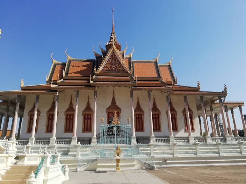 We vinden de ingang voor bezoekers en kopen een ticket. Het gebouw dat onmiddellijk opvalt is de Troonhal met de onmogelijke naam Preah Tineang Tevea Vinicchay. Ten zuiden ervan staat de Hor Samritivimean, de Koninklijke Schatkamer. Het is een klein museum met een verzameling curiosa waaronder zilveren voorwerpen, antieke zwaarden, kostuums en andere koninklijke regalia.
