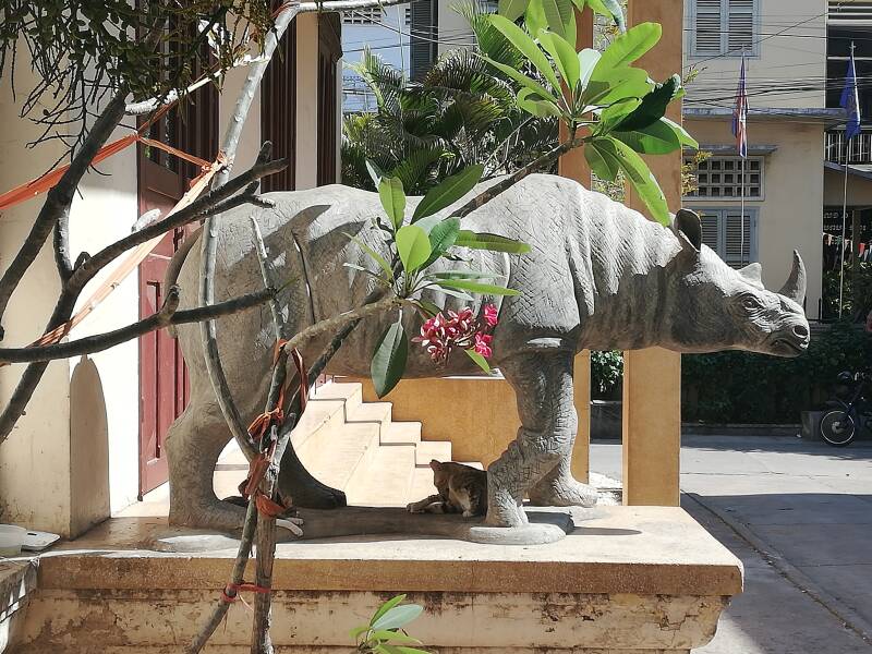 Voor de ingang van de pagode staat het ruiterstandbeeld van koning Norodom. We zien ook de stupa van koning Norodom Suramarit en de stupa van prinses Kantha Bopha die als kind aan leukemie is overleden. In deze stupa werd ook de urne met de as van Norodom Sihanouk bijgezet..