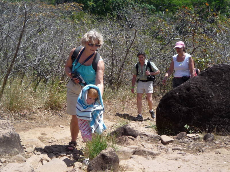 Het gaat heuvelopwaarts. Een weg is er niet, alleen maar een vaag spoor. Dikke wortels versperren ons de weg en maken het stappen moeilijk. We moeten regelmatig rusten. En dan komt er ons een groep mensen tegemoet. Zij leggen de wandeling op aanraden van hun gids in de omgekeerde richting af. Het zijn Belgen. Er wordt zowel Frans als Nederlands gepraat. Ze zijn van zowat overal, ook van Brussel, en van Alsemberg. Een hele buslading vol. Ze zijn nog wat ouder dan ik en hebben het niet gemakkelijk. Dit is dan ook het moeilijkste stuk van de tocht. Dat merken we later.