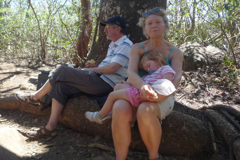 Natuurlijk overdrijf ik. Een beetje. Veel. Maar een beproeving was het, daar op het einde, onder die hete zon op die hete vlakte. En Maïté, dat moedigekleutertje, heeft het een heel eind van die kokendhete wandeling op eigenhoutje afgelegd, half verborgen onder een grote handdoek. Toen we de hel verlieten viel ze pardoes in slaap in oma’s sterke armen. In de schaduw van de bomen terechtgekomen gingen we onmiddellijk zitten om wat bij te komen. We aten er ook onze lunch op, onwetend dat er nauwelijks enkele honderden meters verderop houten tafels en banken stonden voor de vermoeide reiziger.