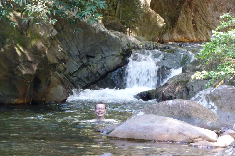 Maar we hadden er nog niet genoeg van. Toen we deze eerste wandeling achter de rug hadden en weer op ons beginpunt aankwamen rustten we wat uit, om daarna aan een nieuwe tocht te beginnen. Als we hem helemaal zouden afleggen zou hij ons na vier uur stappen en klauteren naar de top van de vulkaan Rincón de la Vieja brengen. Wij houden het echter bij een wandeling van nauwelijks twintig minuten die ons naar de poza Rio Blanco brengt, een kloof waarin het water heerlijk koel is. Er zijn nog mensen, een tiental, verspreid over de stenen flanken van de kloof of zittend op grote rotsblokken in het water.