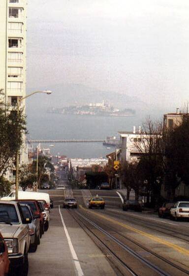Af en toe kruisen we een van de cable cars en beloven onszelf later een ritje in een van deze beroemde trammen. We komen aan de Lombard Street, "the Crookedest Street in the World". In de verte zien we de baai en het eiland Alcatraz, nog zo een beroemd stukje van Frisco. Zigzaggend dalen we de Lombard af en rijden daarna langzaam richting Fisherman's Wharf, het stukje haven waar ons schip gaat aanleggen. We parkeren de wagen en gaan op souvenirjacht. Want is dit niet de stad van de blue jeans ? Een uurtje later liggen er enkele zakken meer in de autokoffer.