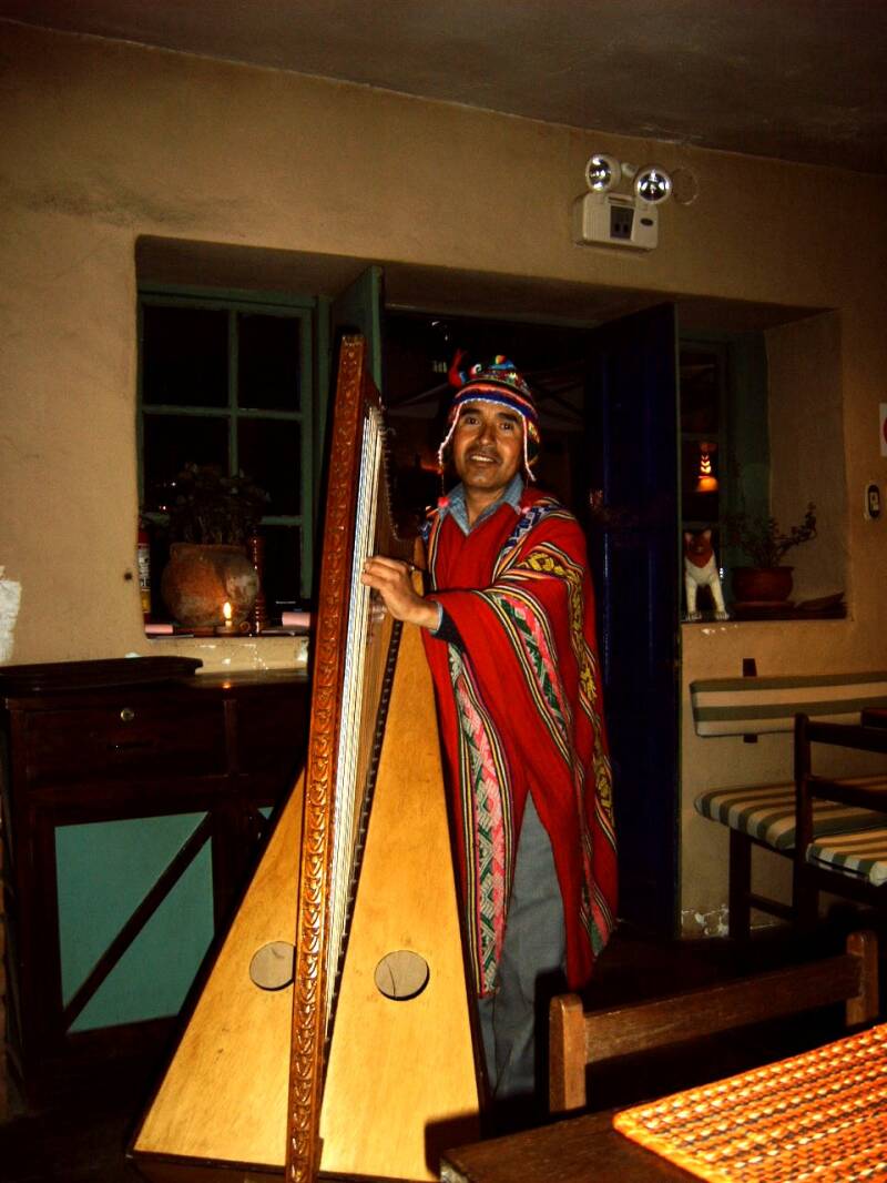 En regenen dat het daar deed! Gelukkig stond onze dappere vriendin van het reisbureau ons in het donker en de regen op te wachten, gewapend met een paraplu en een chauffeur, zodat we weer snel in ons hotel Tika Wasi waren, in de mooie wijk San Blas. Die avond – onze laatste avond in Cuzco – zijn we gaan eten in het restaurant Pacha Papa rechtover de kerk van San Blas. Een echte aanrader! Lekker eten, vriendelijke bediening, heel stemmig decor, en een zanger-harpist die de stemming nog wat kwam verbeteren. Natuurlijk hebben we zijn CD gekocht, weet je wel, muzikanten onder elkaar. Er zaten trouwens enkele bekenden in het restaurant: de twee jonge Hollanders die we nu al voor de derde keer tegenkwamen, en een Duits echtpaar dat we in ons hotel in Arequipa hadden ontmoet.