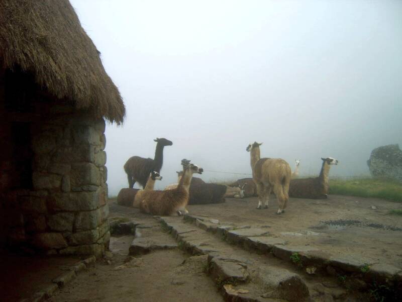 Vrijdag 17 februari. Zoals onze “Trotter” ons aanraadde namen we de eerste bus naar de site. En niettegenstaande die bus om zes uur vertrok zat hij helemaal vol. Het was mistig, je zag maar enkele tientallen meters ver. En zo was het ook boven. Machu Picchu verborg zich voor ons, ook toen de zon opkwam. We doken dan toch maar de ruļnes in, maar veel meer dan muren en poorten en trappen konden we niet zien. Lieke begon te foeteren. We hadden evengoed nog enkele uren onder de wol kunnen liggen. Ze had gelijk natuurlijk. Ik voelde me wat schuldig, maar kon er ook niets meer aan veranderen. We klommen naar de mirador, vanwaar we – zonder mist – een prachtig uitzicht over de site moesten hebben. Nu vonden we enkel wat verdwaalde lama’s die daarboven aan het herkauwen waren.