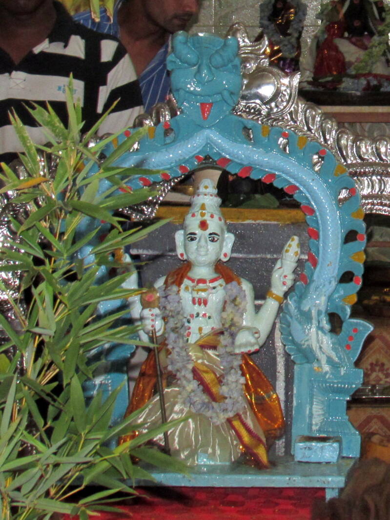 We zijn er ruim op tijd. Achteraan in de nu nog lege tempel zitten Ganesh en Kataragama te wachten in hun schrijn op wat komen gaat. Kataragama zal vanavond in het huwelijk treden en daardoor de beschermgod van de tempel worden. Buiten beginnen de dorpelingen zich te verzamelen.