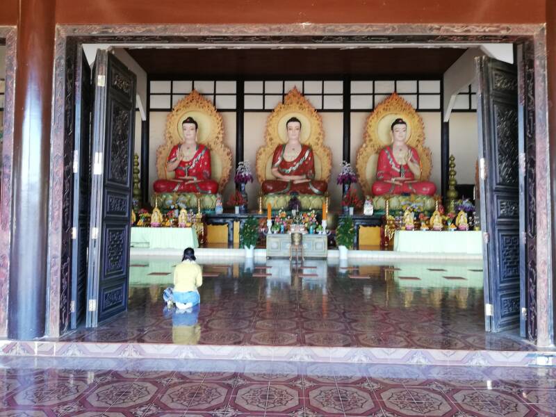 We gaan het terrein op. Identieke bodhisattva-beelden van bijna 3 meter hoog staan plechtig in lange rijen op een stenen platform. We gaan naar het grote heiligdom dat in in 1999 is gebouwd. Het dak is bedekt met rode tegels.