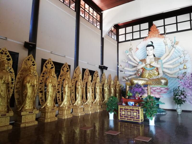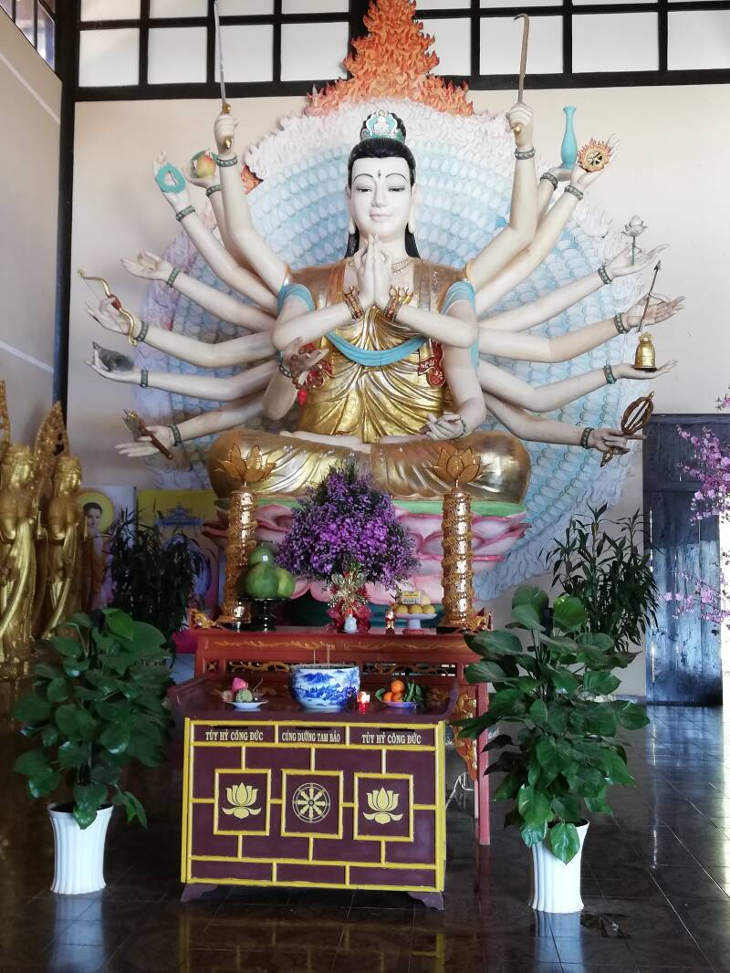 In de grote zaal staan veelarmige boeddha's naast vele andere beelden. Een monnik reciteert een tekst en laat af en toe een grote klok galmen. We struinen nog wat rond en schieten een hele lader foto's af voor we terug op weg gaan.
