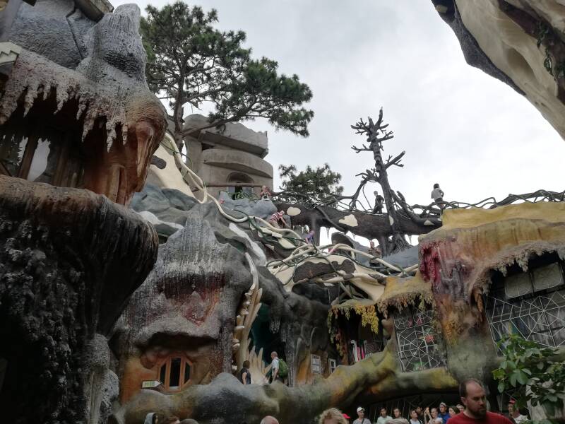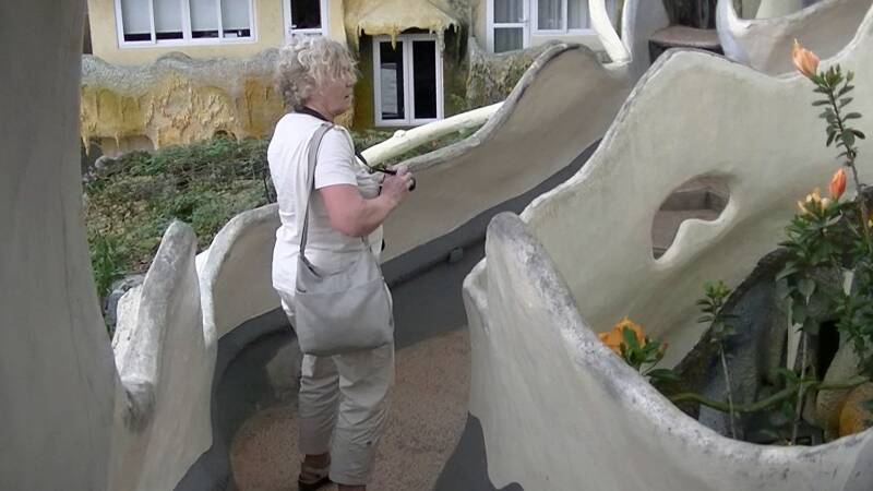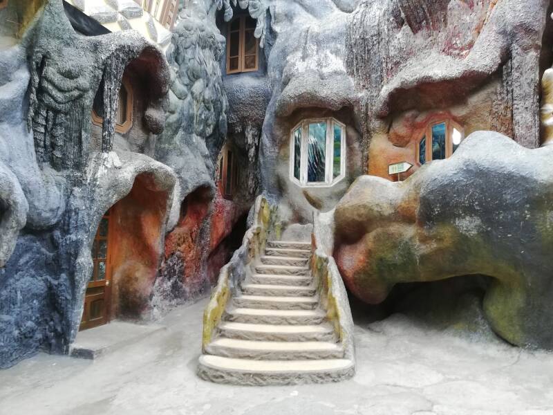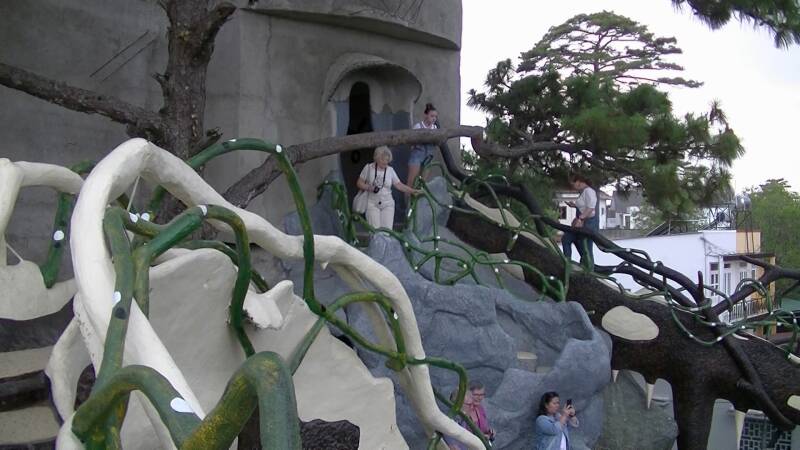 En dan bezoeken we het Crazy House. De officiële naam is 'Hang Nga Guesthouse', want je kunt er een kamer huren, maar de naam Crazy House past er veel beter bij. Architecte Hang Nga liet zich inspireren door de natuurlijke omgeving van de stad, samen met het werk van de Catalaanse architect Gaudi. In Barcelona hebben we verschillende bouwwerken van Gaudi bezocht, en we kunnen dit alleen maar beamen
