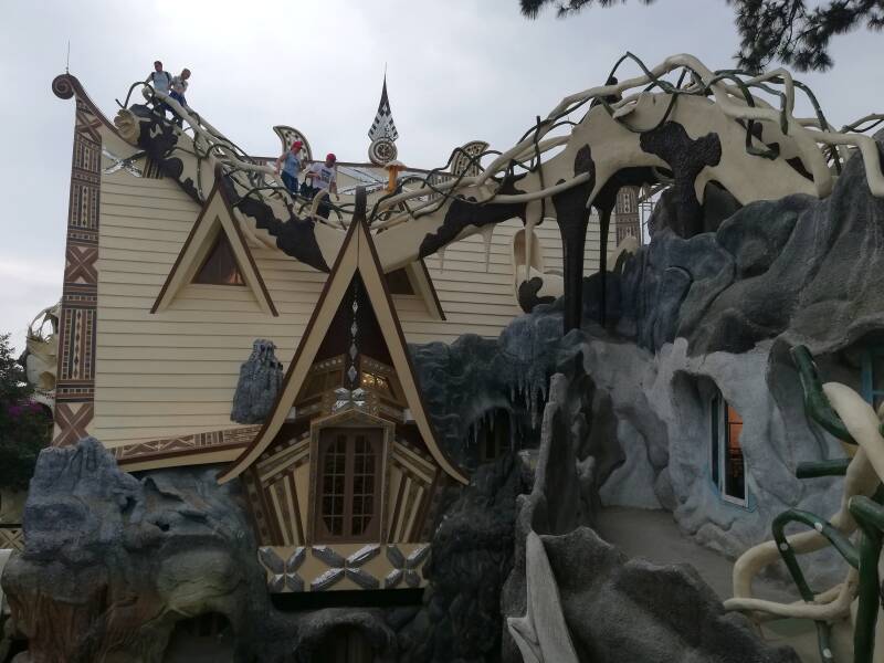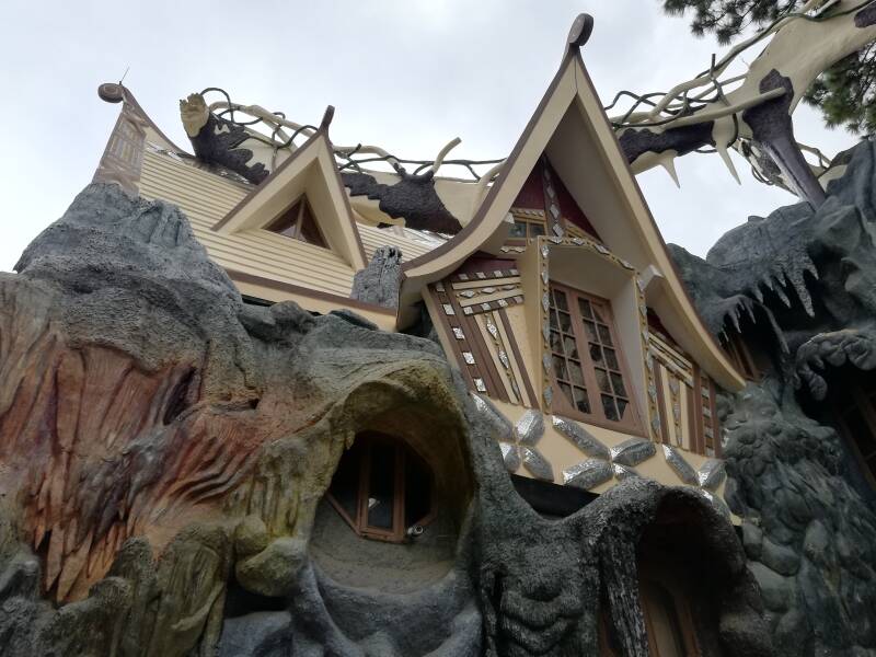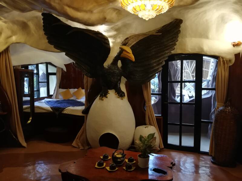 Het gastenverblijf heeft tien themakamers, elk met een dier als thema, zoals de tijgerkamer en de adelaarskamer, elk met decoraties passend bij het thema. Meubels in de kamers zijn met de hand gemaakt - en soms zelfs ingebouwd in de kamers zelf - om te passen bij de organische vorm van de kamers. Stenen decoraties in het hele huis verbeelden dieren zoals beren, giraffen, kikkers, spinnen en mieren, samen met natuurlijke elementen zoals paddenstoelen en spinnenwebben. Trappen en gangen in het gebouw zijn ontworpen om op tunnels en grotten te lijken. Het is echt wel een speciale ervaring om hier rond te dolen. Maar als je ziet hoeveel bezoekers er op afkomen, weet ik niet of het een goed idee is om hier een kamer te huren...