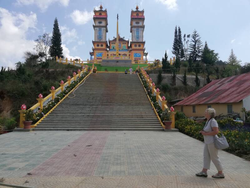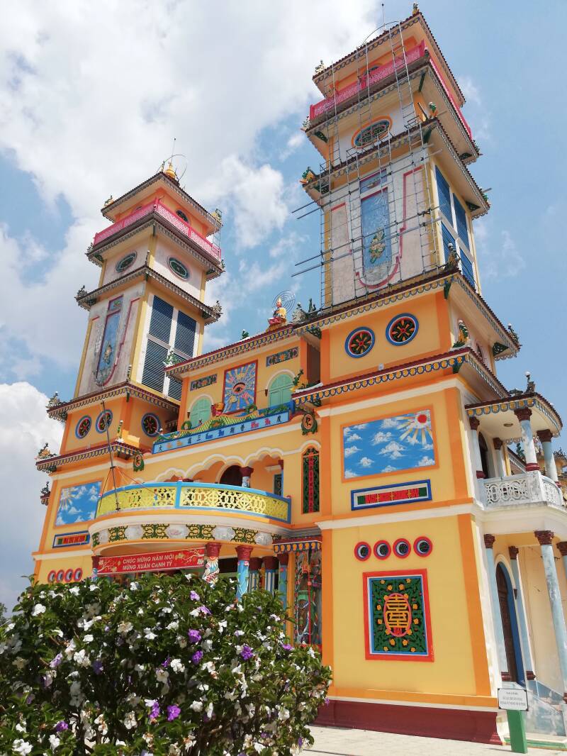 Dichtbij onze eindbestemming bezoeken we een Cao Dai tempel. Het Caodaisme (1926) tracht het beste uit alle wereldreligies te halen en dit te combineren tot één geloof. Het is een mengelmoes van het Boeddhisme, de Islam, het Confucianisme, het Taoïsme, het Hindoeïsme, het Vietnamese Spiritualisme en het Christendom. Deze invloeden zie je terug in hun indrukwekkende en erg kleurrijke tempels.