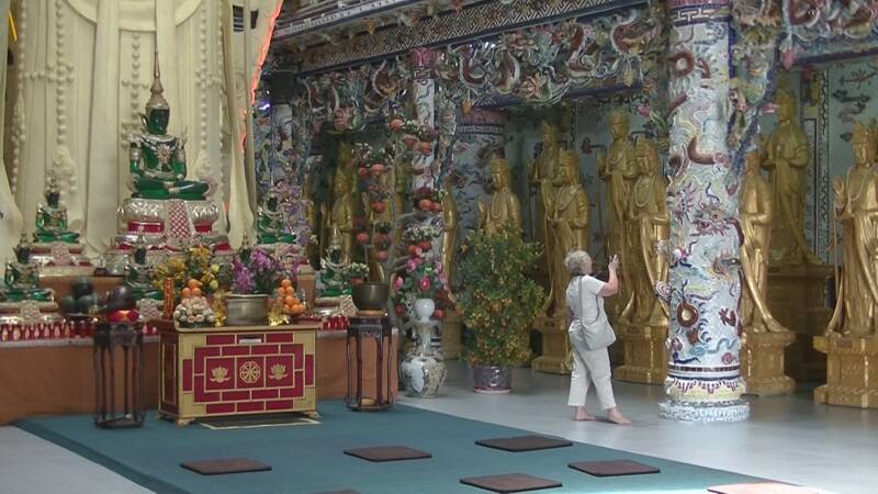 We bezoeken de tempel en kunnen er een korte ceremonie bijwonen, al moeten we ons in alle bochten wringen om een en ander op de gevoelige lens te krijgen. Er zijn immers bepaalde stukken vloer waarop we onze voeten niet mogen neerzetten. Ons schoeisel hebben we buiten al mogen achterlaten. Het staat trouw te wachten als we de tempel weer verlaten.