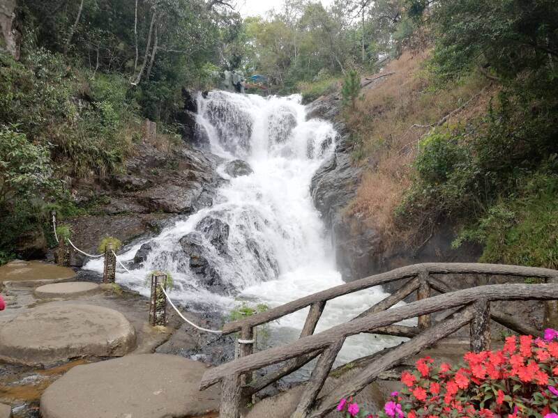 Het is een hele rit om onze laatste bestemming met de Easy Riders te bereiken. We zitten ten westen van Da Lat, en we moeten nu terug naar de stad en door het centrum 5 km noordwaarts, waar de Datanla-waterval op ons stroomt te wachten. De wandeling naar de waterval voert door het regenwoud en duurt een dikke tien minuten. De waterval is bijzonder fotogeniek, als je tenminste de beelden van pony's, meisjes en mannen in berenpakken buiten beeld houdt. Nu, enkele mogen er wel op de foto, al is het maar om te laten zien dat ze hier helemaal niet op hun plaats zijn.