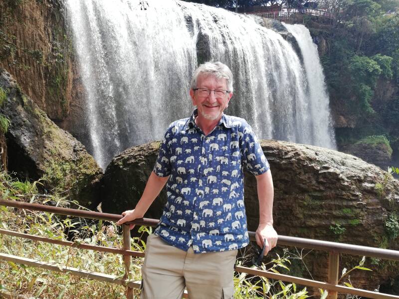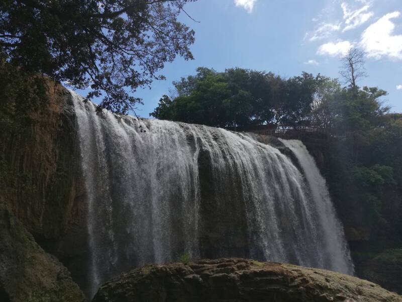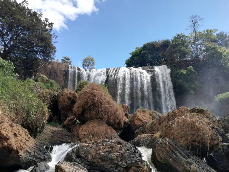 De Easy Riders brengen ons daarna naar de Olifantswaterval (Thac Voi). We zijn nu zo'n 30 km ten westen van Da Lat, op een hoogte van 1080 meter boven de zeespiegel. De nabijgelegen rotsformaties zijn al even spectaculair als de waterval zelf. We gaan naar de voet van de waterval. Het is een pittige afdaling, maar gelukkig zijn er wat treden in de rotsen uitgehakt. In ieder geval is onze inspanning meer dan de moeite waard. Wat een mooie plek is dit!