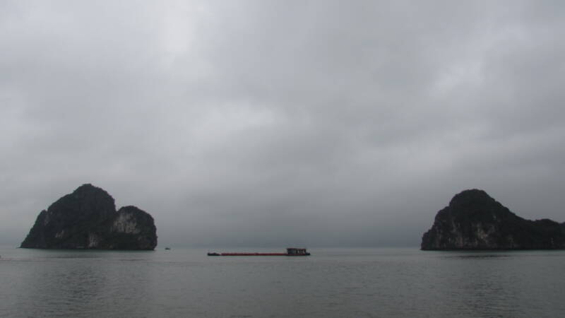 Na het ontbijt varen we terug naar het vasteland. Dreigende wolken pakken zich samen, maar het blijft droog. De lucht en de zee versmelten met elkaar en maken de baai nog geheimzinniger. Het zou ons niet verwonderen moest de draak van Ha Long plots uit het water opduiken. Maar dat gebeurt dan toch niet.