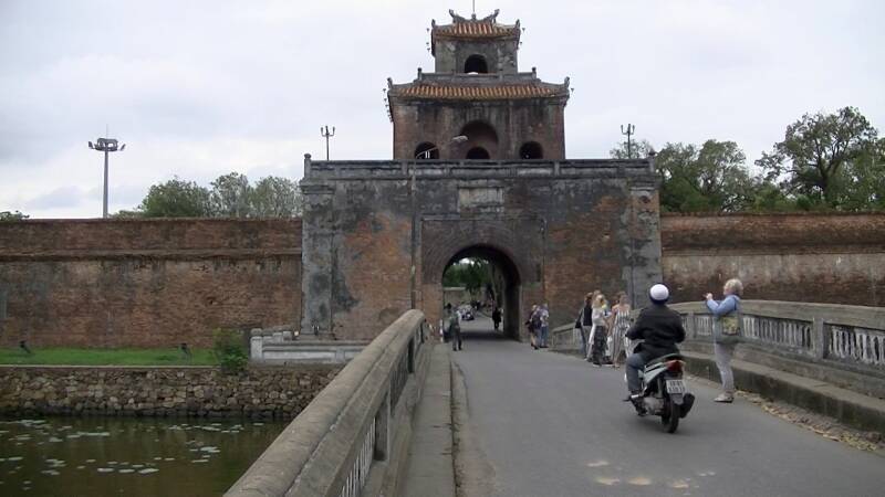 We varen terug naar de stad. Het is hoogtijd om te middagmalen. Daarna bezoeken we de Kinh Thanh, de citadel van Hué. Ze is ongeveer 520 ha groot en wordt omgeven door een 8 m hoge en 20 m dikke muur. In deze 10 km lange muur zijn 10 grote poorten. Ten zuiden van de muur staat de 37 m hoge Cot Co (Vlaggentoren).