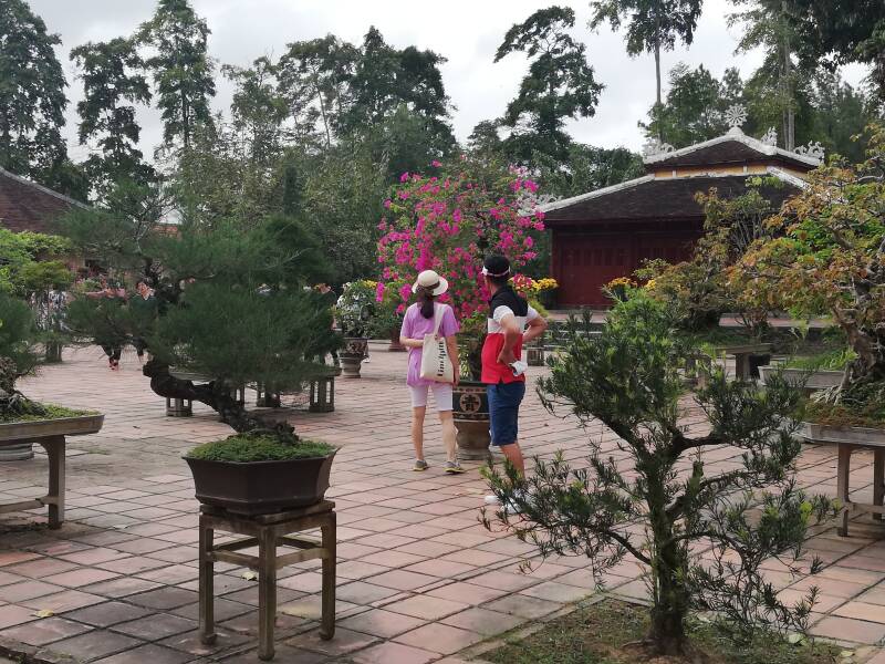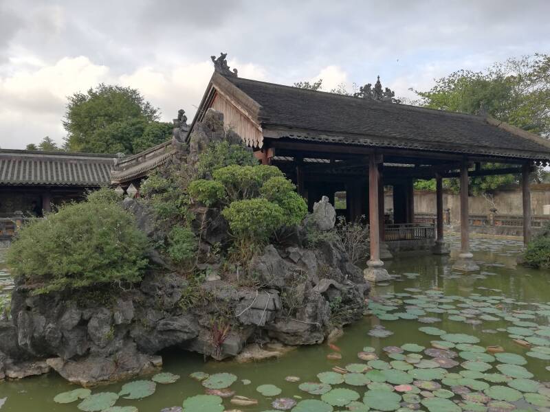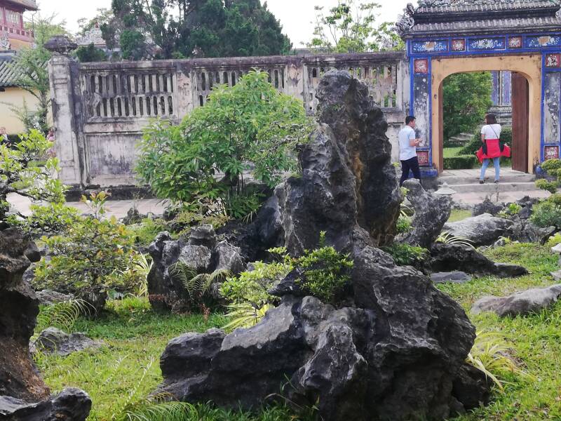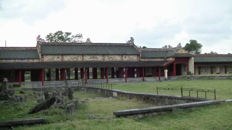Aan de linker- en rechterkant liggen de Zalen van de Mandarijnen In de linkerzaal kunnen bezoekers zich laten fotograferen in kleding uit de keizerlijke periode. In de rechtse zaal is een deel van de collectie van het Museum van Oudheden te zien. In het Keizerlijk Theater worden regelmatig dansvoorstellingen gegeven. Achter het theater bevindt zich het Leespaviljoen van de keizer, fraai versierd met keramische tegeltjes. Vlakbij wordt een aantal overdekte passages gebouwd in de stijl van de Nguyen-dynastie. Links en rechts van het lege terrein erachter staan twee achthoekige muziekpaviljoens.