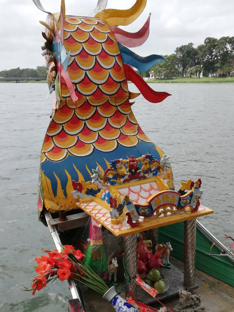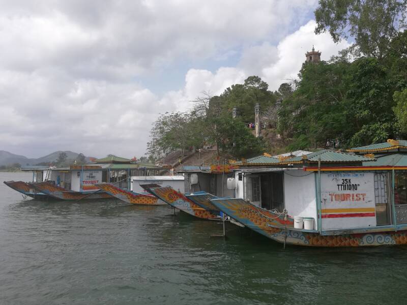 We maken er dan maar het beste van en vertrekken onmiddellijk naar de Song Huong (Parfumrivier), waar we inschepen voor een tochtje dat ons tot aan de Thien Mu-pagode brengt, de Pagode van de Hemelse Dame.