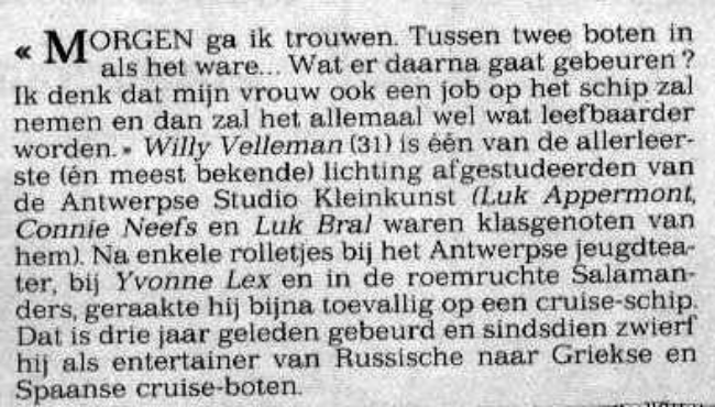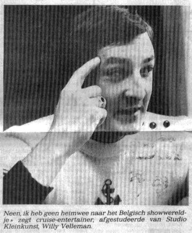 Willy Velleman (31) is een van de allereerste én meest bekende lichting afgestudeerden van de Antwerpse Studio Kleinkunst. (Luk Appermont, Connie Neefs en Luk Bral waren klasgenoten van hem). Na enkele rolletjes bij het Antwerpse jeugdtheater, bij Yvonne Lex en in de roemruchte Salamanders, geraakte hij bijna toevallig op een cruiseschip. Dat is drie jaar geleden gebeurd en sindsdien zwierf hij als entertainer van Russische naar Griekse en Spaanse cruiseboten.
